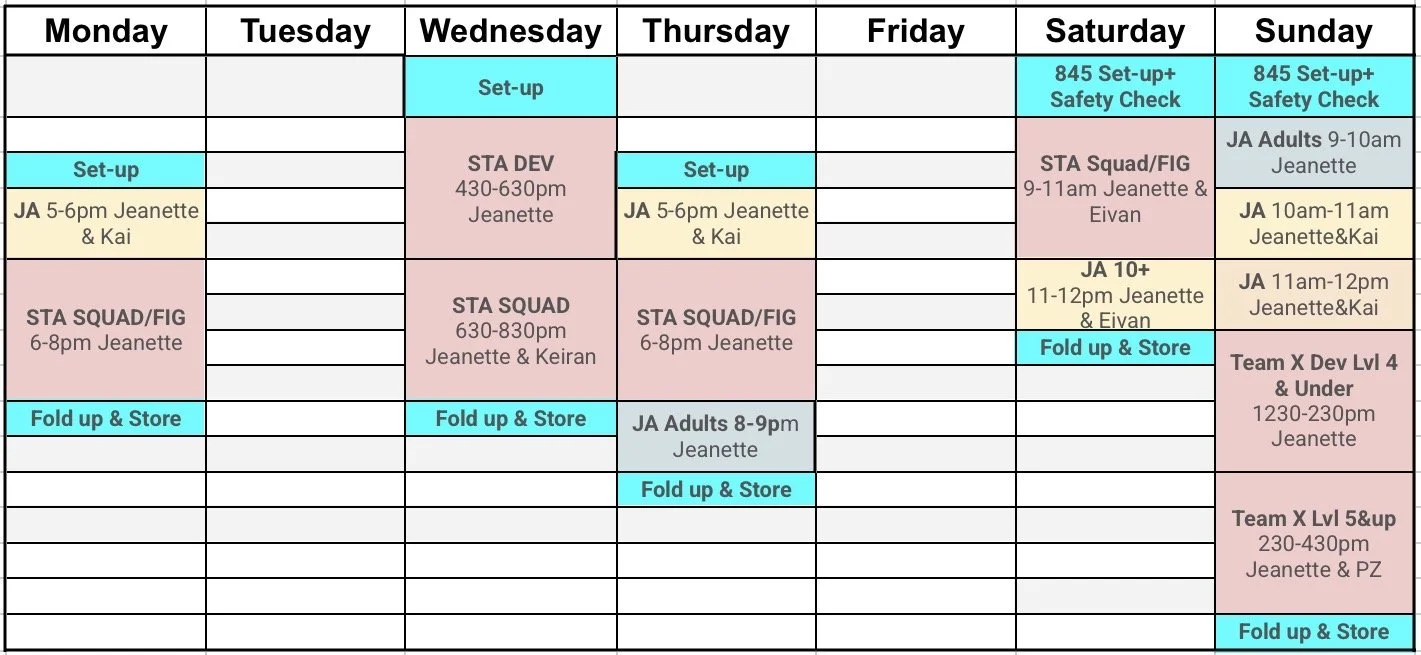 Competitive training programs align with Singapore Gymnastics and the Technical Handbook for Trampoline Gymnastics.